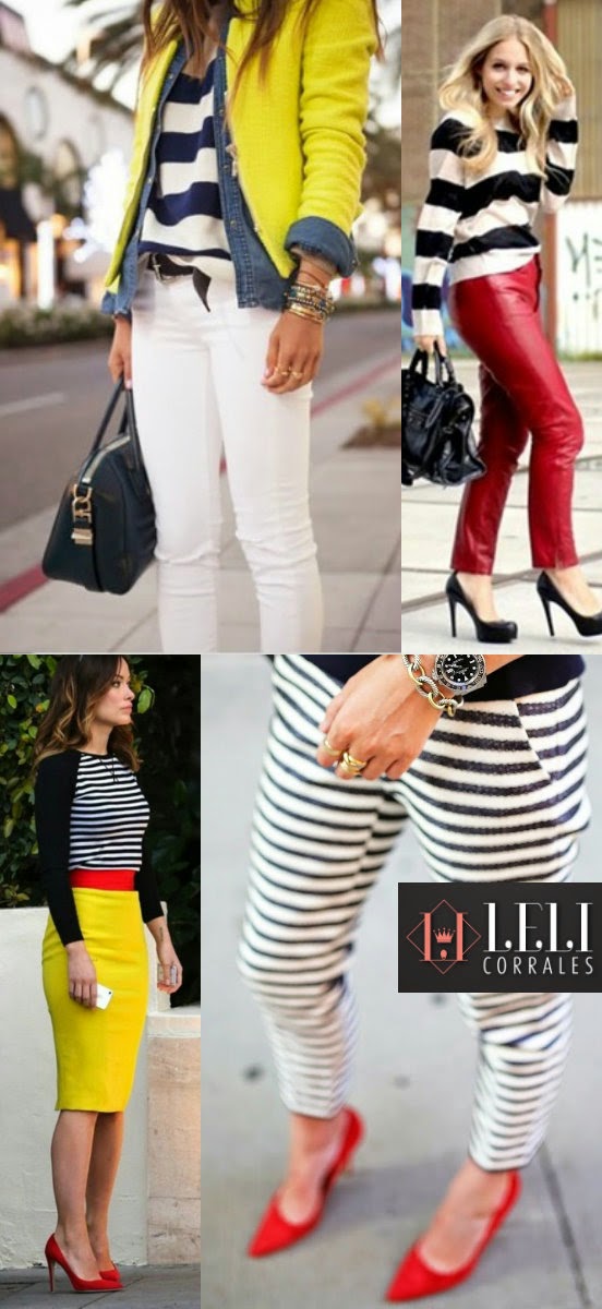 Peças listradas combinadas com algum item colorido resultam em composições estilosas e modernas. Pode ser um blazer, um sapato ou qualquer outro acessório colorido…a combinação é perfeita.