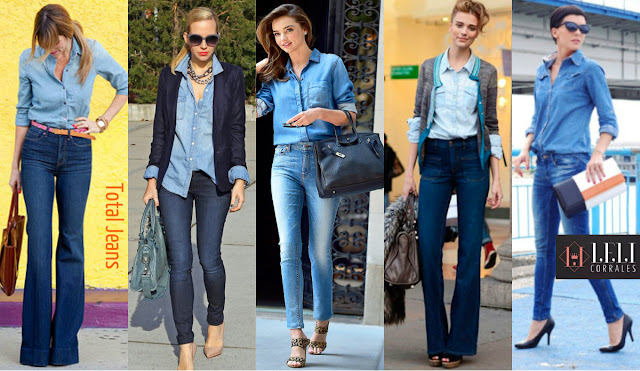 | Looks ‘total jeans’ são um clássico e estão super na moda. Você pode usar peças com lavagens próximas ou bem diferentes, criando um contraste bacana (veja o 2° look: calça, camisa e blazer – combinação com diferentes tonalidades de jeans). Um maxi colar ou maxi bolsa são acessórios muito bem vindos às produções. |