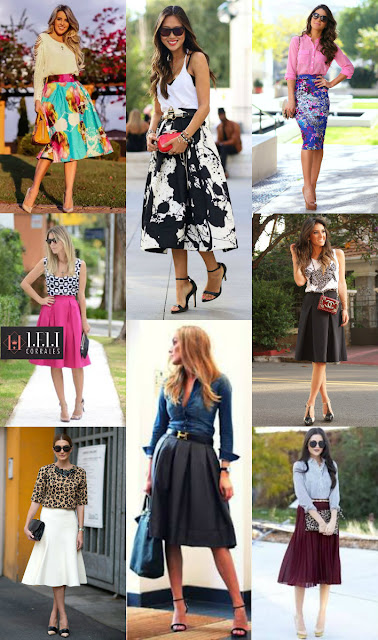 Sapatos: sapatos com salto sempre ajudam a favorecer a silhueta. Scarpins e sandálias de tiras finas em cores neutras, alongam a parte que se torna visível pela saia midi. Mas o ideal é perceber que estilo combina mais com você e usar a criatividade na hora de montar o look.