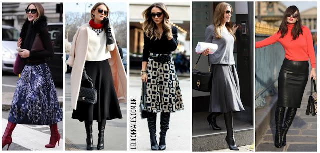 | Já pensaram em combinar uma saia na altura dos joelhos com bota cano longo? Pois saibam que fica super bem…portanto, apostem de olhos fechados. |